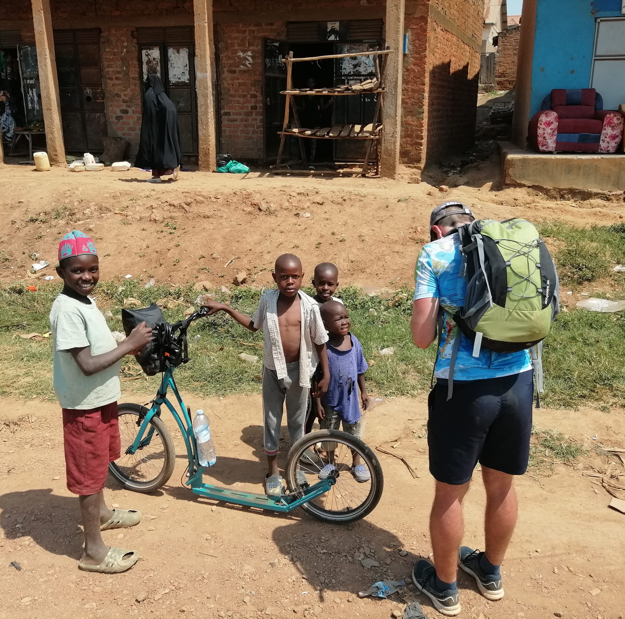 Przechodząc z opinii pragmatyki, czyli do testów. W styczniu i lutym 2023 roku wybraliśmy się w towarzystwie Piotra z Gdańska do Afryki Równikowej. W międzyczasie pozbyłem się już towarzyszącej nam podczas wyprawy po Etiopii hulajnogi Kickbike. Długo poszukiwaliśmy sprzętu dla Piotrka. Odebraliśmy pozytywne sygnały od Piotra z Bydgoszczy i Adama z Gliwic za co serdecznie dziękuję. Jednakże wyjazd do Afryki, zawsze niesie ze sobą ryzyko utraty hulajnogi. Ostatecznie podjęliśmy decyzję, że zabierzemy w trasę malucha. Układ był prosty. Uczestnik poruszający się na hulajnodze z kołami 26×26 (MIBO GoodSpeed) zabiera sakwy, druga osoba na małych kółkach jedzie na lekko. W pierwotnym założeniu mieliśmy co jakiś czas się zamieniać. Jednakże dyscyplinę wymiany, stosowaliśmy przez pierwsze dwa dni wycieczki. Później Piotr bardzo polubił MIBO Royal i tym sposobem odbył na niej całą trasę hulania przez Rwandę oraz Ugandę. Hulajnoga w Afryce sprawowała się świetnie. Wcale nie odbiegała „kondycją” od większego modelu MIBO GoodSpeed. Radziła sobie doskonale na czerwonych afrykańskich drogach. Przy stromych podjazdach należało ją podprowadzić. Co więcej, małą hulajnogę wygodniej było nieść przez lasy równikowe w miejscach, gdzie nie byliśmy, w stanie hulać. MIBO Royal okazała się świetnym środkiem dydaktycznym. Ponieważ mieszkańcy Ugandy i Rwandy chętnie na niej hulali. Wysnułem wniosek, że hulajnoga na mniejszych kołach prawdopodobnie jest bardziej interakcyjna od dużych kół. Być może wynika to po prostu z ludzkich wspomnieć. Przekonałem się, że w wielu miejscach świata dzieci za młodu używają hulajnogi, później niestety aktywność idzie w zapomnienie.