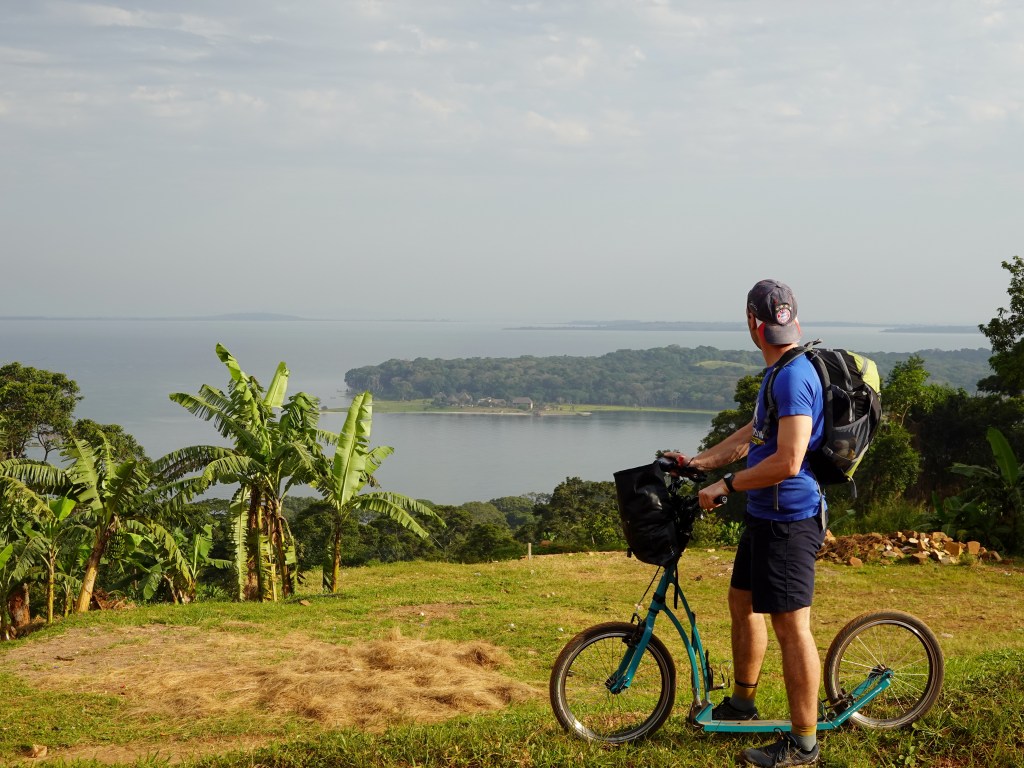 Hulacz Piotrek na MIBO Royal w tle największego afrykańskiego jeziora (Uganda, styczeń 2023 roku)