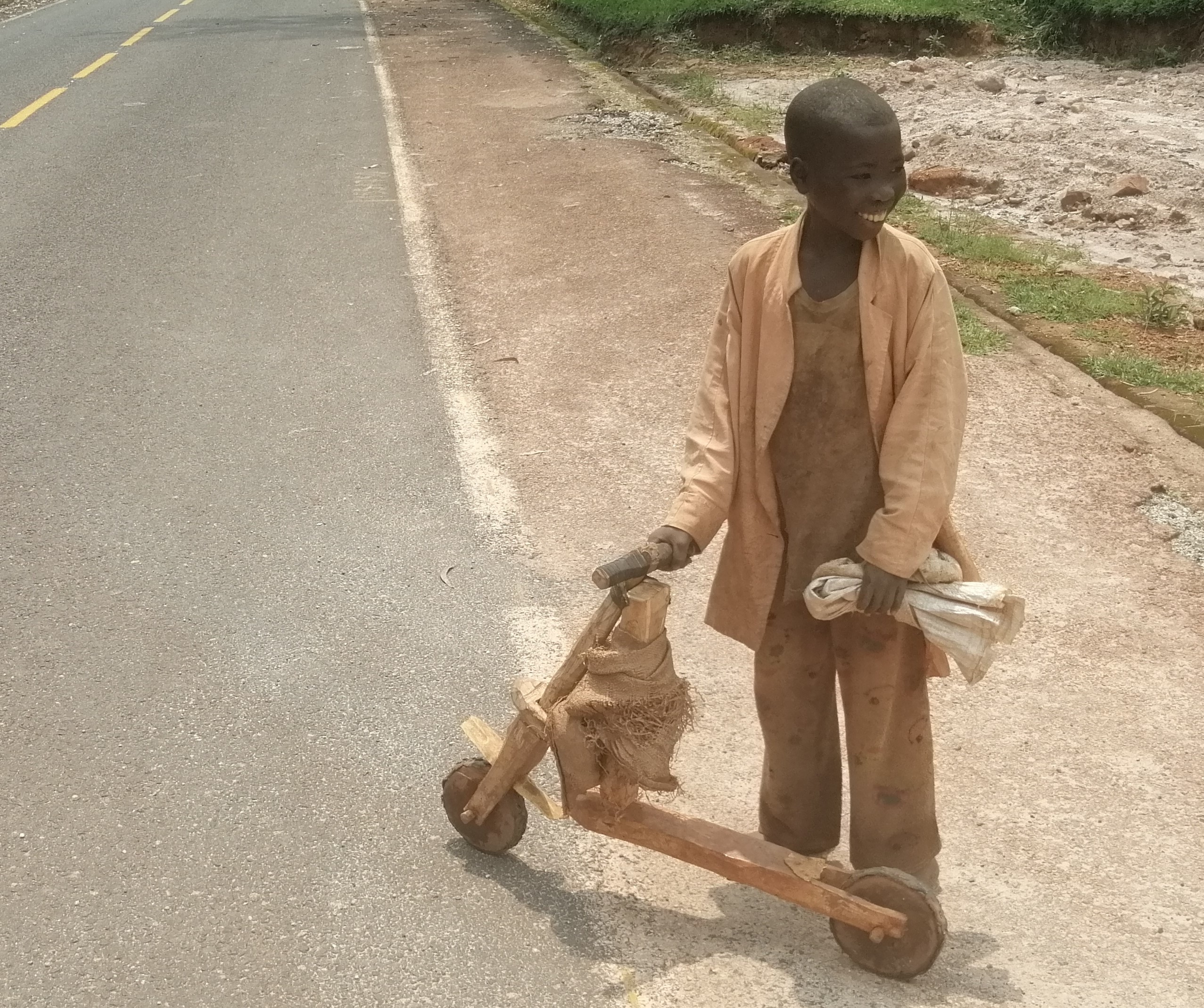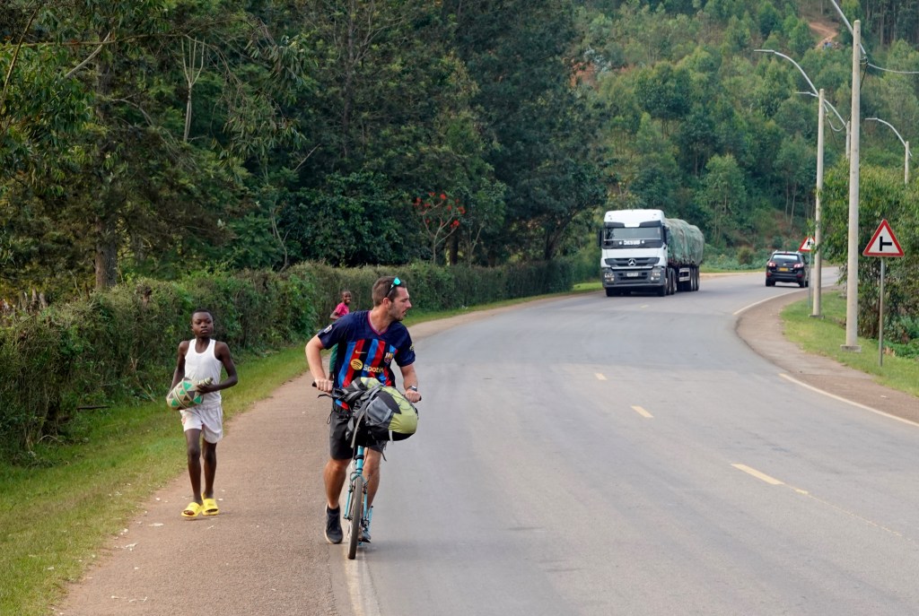 Samotnie wyruszyłem w trzydniową podróż przez Rwandę w kierunku Tanganiki. Mam wrażenie, że południe Rwandy było bogatsze i bardziej zurbanizowane niż północ. Pusto zrobiło się tak naprawdę 20 kilometrów od przejścia granicznego z Burundi. W pierwszym dniu hulanie było mało przyjemne przez duży ruch samochodowy. Pomimo opowieści Brytyjczyka, według mnie w Rwandzie nie brakowało ulicznego jedzenia. Można było bez problemu skosztować przydrożnego grilla (szaszłyki, kurczaki, warzywa). W Rwandzie nie brakowało też restauracji w których panowała zasada jesz, ile jesteś w stanie nałożyć na talerz. Pamiętam, że pewnego razu zatrzymałem się w celu ujęcia w kadrze aparatu malowniczego krajobrazu. Chwilę później ruszyłem nie zauważając, że zgubiłem pieniądze. Po chwili dogonił mnie motocyklista i podał banknot. Niespotykany gest w Afryce. W Rwandzie spróbowałem chlebowca. W trakcie konsumpcji dwukrotnie przesiadałem się z jednych krzaków do drugich krzaków. Ponieważ kiedy dobierałem się do kleistego owocu zaraz zbierał się grupa Rwandyjek komentująca moje dziwne zachowanie. Sytuacja, w której się znalazłem była na tyle śmieszna, że niewiasty komentowały moje włosy na rękach i uzębienie pokazując palcami. W Rwandzie w mojej głowie zapisał się bardzo ważny obraz, spotkałem pierwszą hulajnogę na trasie. Chłopca, który miał piękną drewnianą hulajnogę (100% ręczna robota).