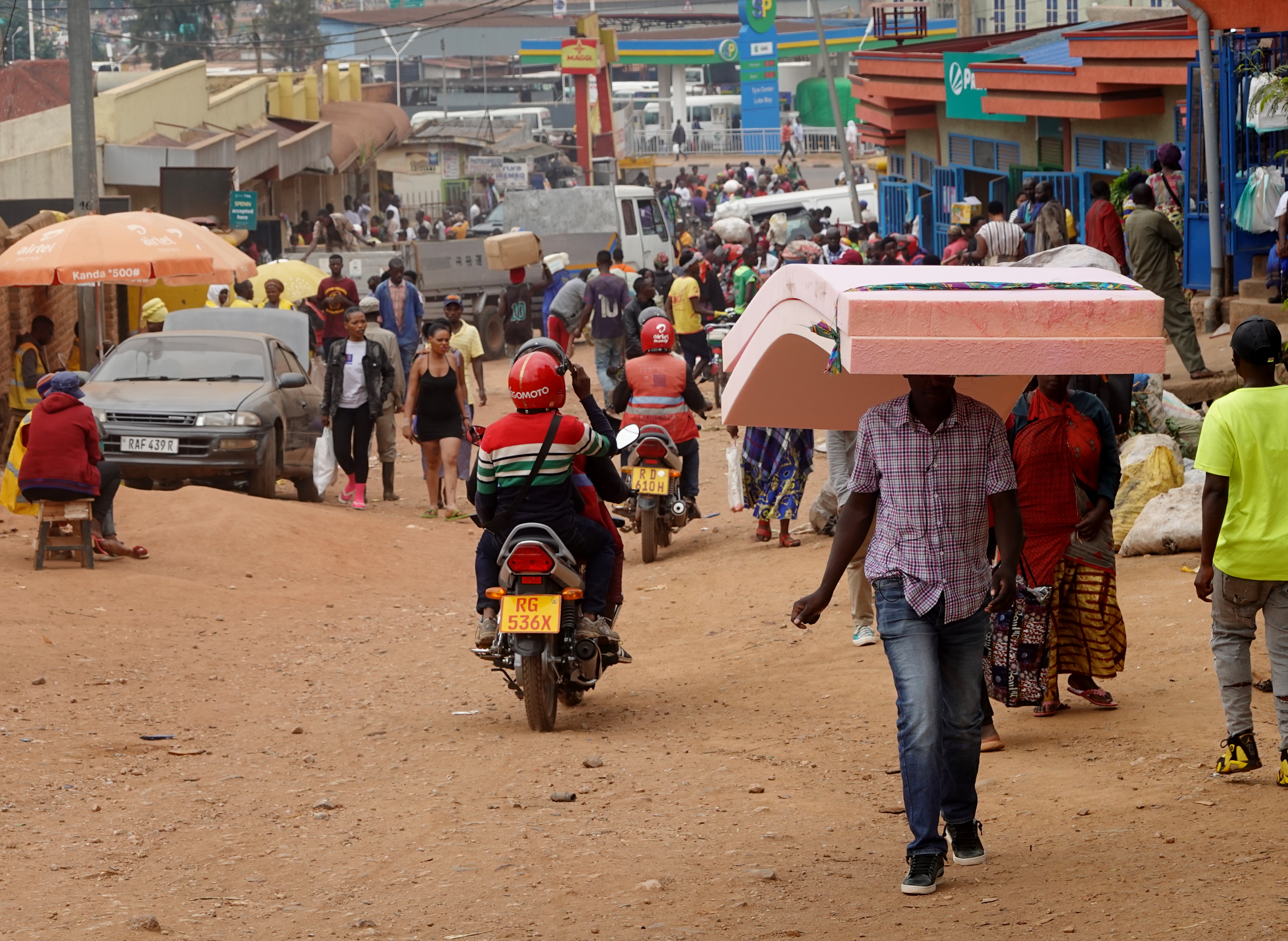 Ostatnie kilometry w Ugandzie były niezwykle przyjemne. Po drodze do przejścia granicznego ścigaliśmy się z chłopakiem, który wiózł na bazar ścianę różnych przedmiotów produkcji azjatyckiej. W towarzystwie Piotra błyskawicznie przeskoczyliśmy ugandyjskie przejście graniczne. Kłopoty zaczęły się po stronie Rwandy. Trochę się tego spodziewaliśmy w końcu przekraczaliśmy granicę afrykańskiego ulubieńca zachodu, który szczycie się dyktaturą, poszanowaniem praw człowieka oraz szczelnymi i biurokratycznymi granicami. Na przejściu tłumy jak niegdyś w sektorze gości na derbach miasta Łodzi. Kolejka nie kurczyła się, bo co chwila w połowie znajduje się cwaniak, który wpycha do okienka siostrzeńców, wujków, znajomych, kochankę. Nie wiem, ile czasu spędziliśmy na granicy, pamiętam, że w końcu odpuściliśmy stanie i wdaliśmy się w rozmowę z Brytyjczykiem, który podróżował samotnie rowerem z Kapsztadu do Kampali. Opowiadał dużo ciekawych historii, ale najbardziej utkwiło mi w głowie, że poleca Tanzanię jakie fantastyczny kierunek podróży rowerowej, a w Rwandzie nie ma street foodów. Po otrzymaniu pieczątki ruszyliśmy do Kigali.